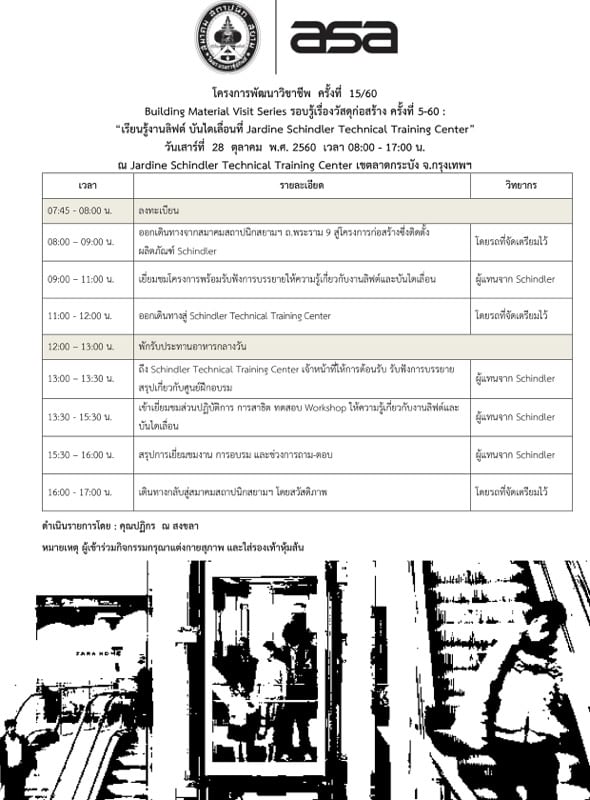 28 ต.ค. 60 | โครงการพัฒนาวิชาชีพ ครั้งที่ 15/60 “เรียนรู้งานลิฟต์ บันไดเลื่อน ที่ Jardine Schindler Technical Training Center”