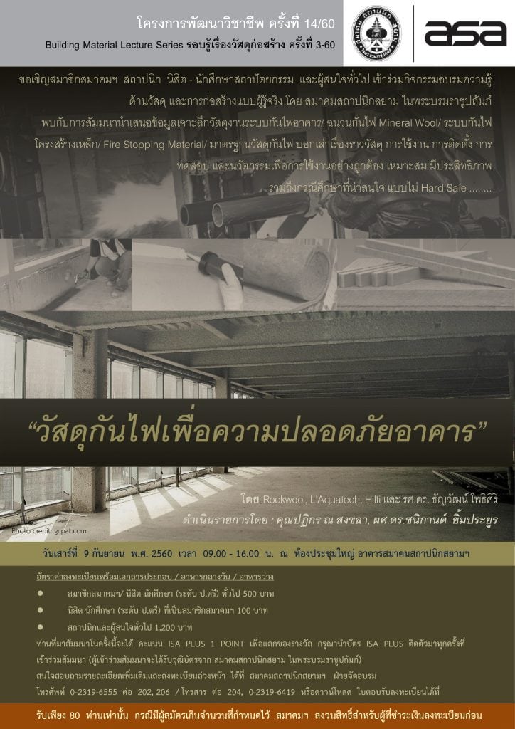 Home » News » 9 ก.ย. 60 | โครงการพัฒนาวิชาชีพ ครั้งที่ 14/60 “วัสดุกันไฟเพื่อความปลอดภัยอาคาร”