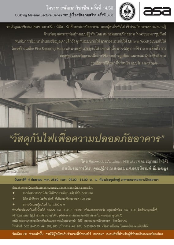 9 ก.ย. 60 | โครงการพัฒนาวิชาชีพ ครั้งที่ 14/60 “วัสดุกันไฟเพื่อความปลอดภัยอาคาร”