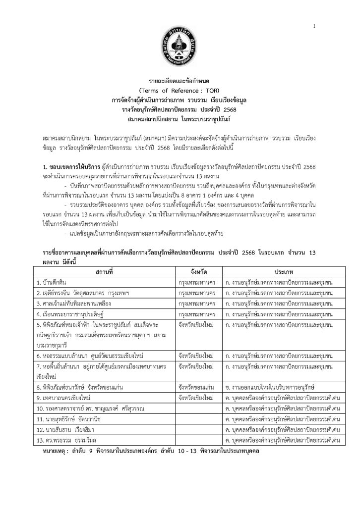 Home » News » ประกาศจัดจ้างผู้ดำเนินการถ่ายภาพ รวบรวม เรียบเรียงข้อมูล รางวัลอนุรักษ์ศิลปสถาปัตยกรรม ประจำปี 2568