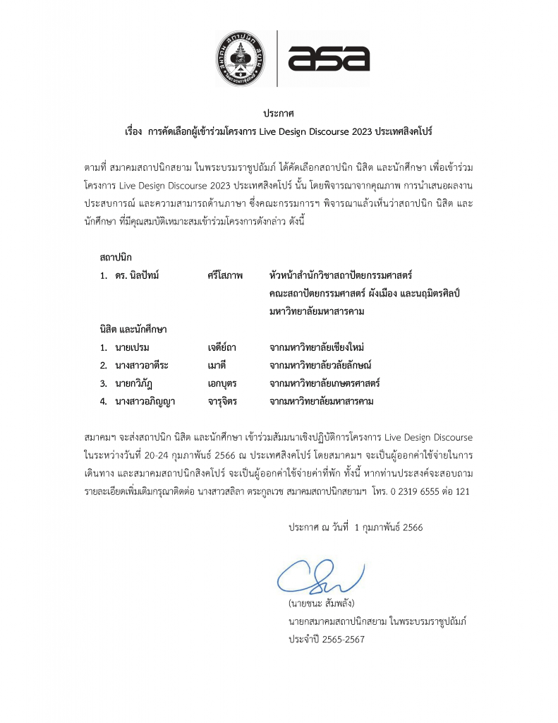 ประกาศผลการคัดเลือกผู้เข้าร่วมโครงการ Live Design Discourse 2023 ประเทศสิงค์โปร์