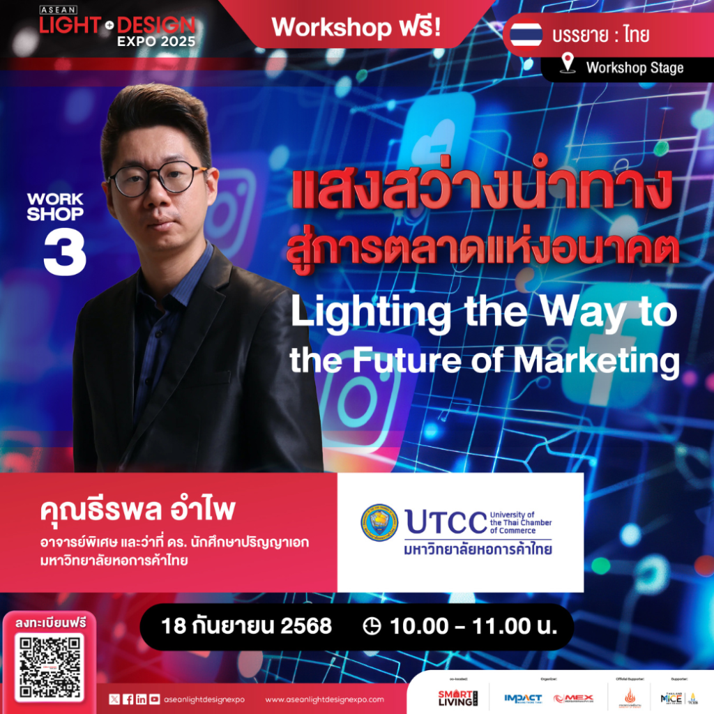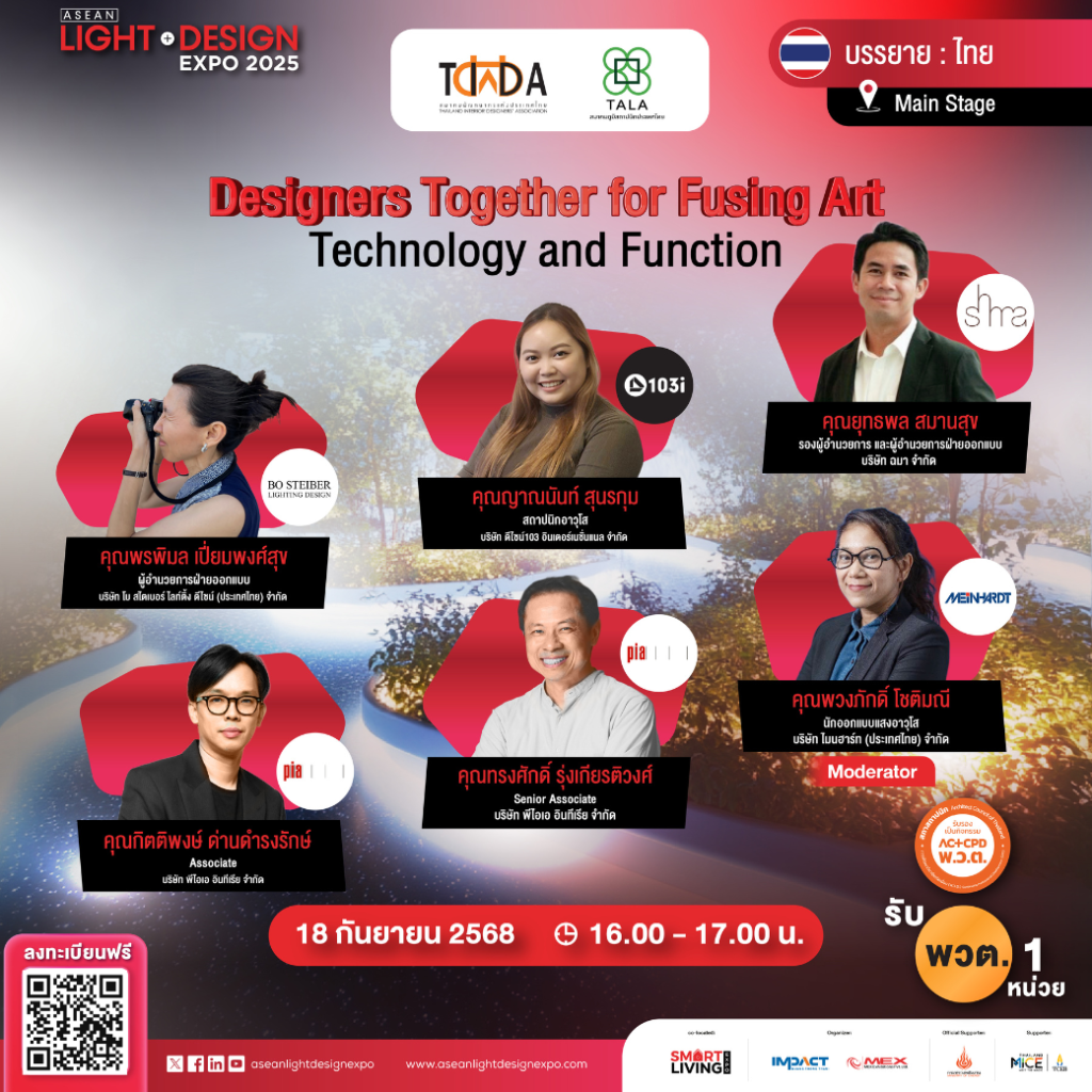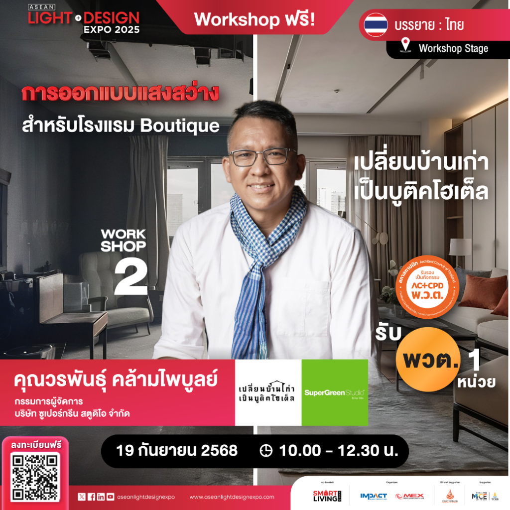 ร่วมสัมผัส 3 วันเต็มของเวทีสัมมนาและเวิร์กชอป กับงานแสดงสินค้าและสัมมนาด้านเทคโนโลยีแสงสว่าง การออกแบบ และการอยู่อาศัยอัจฉริยะระดับอาเซียน ที่รวมสุดยอดนักออกแบบ นักวิชาการ และผู้เชี่ยวชาญด้านแสงสว่าง และ Smart Living กว่า 30 ท่าน