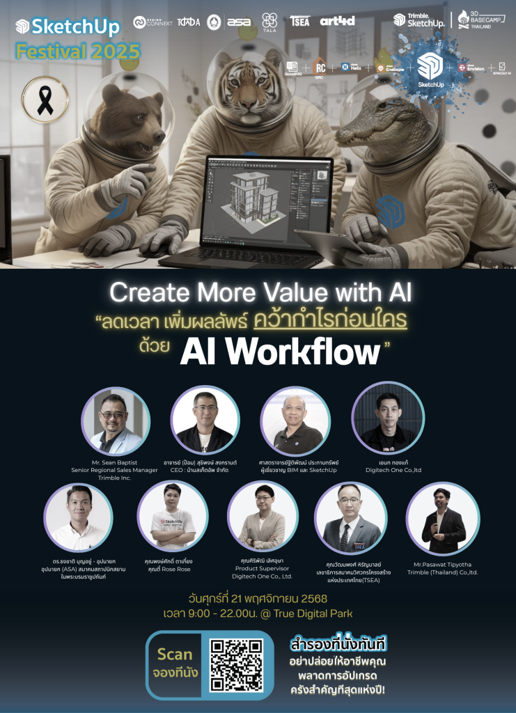 สมาคมสถาปนิกสยาม ในพระบรมราชูปถัมภ์ ขอเชิญสถาปนิก นักออกแบบ และผู้สนใจในเทคโนโลยีการออกแบบ ร่วมเปิดประสบการณ์ใหม่ในงาน “SketchUp Festival 2025 : Create More Value with AI”