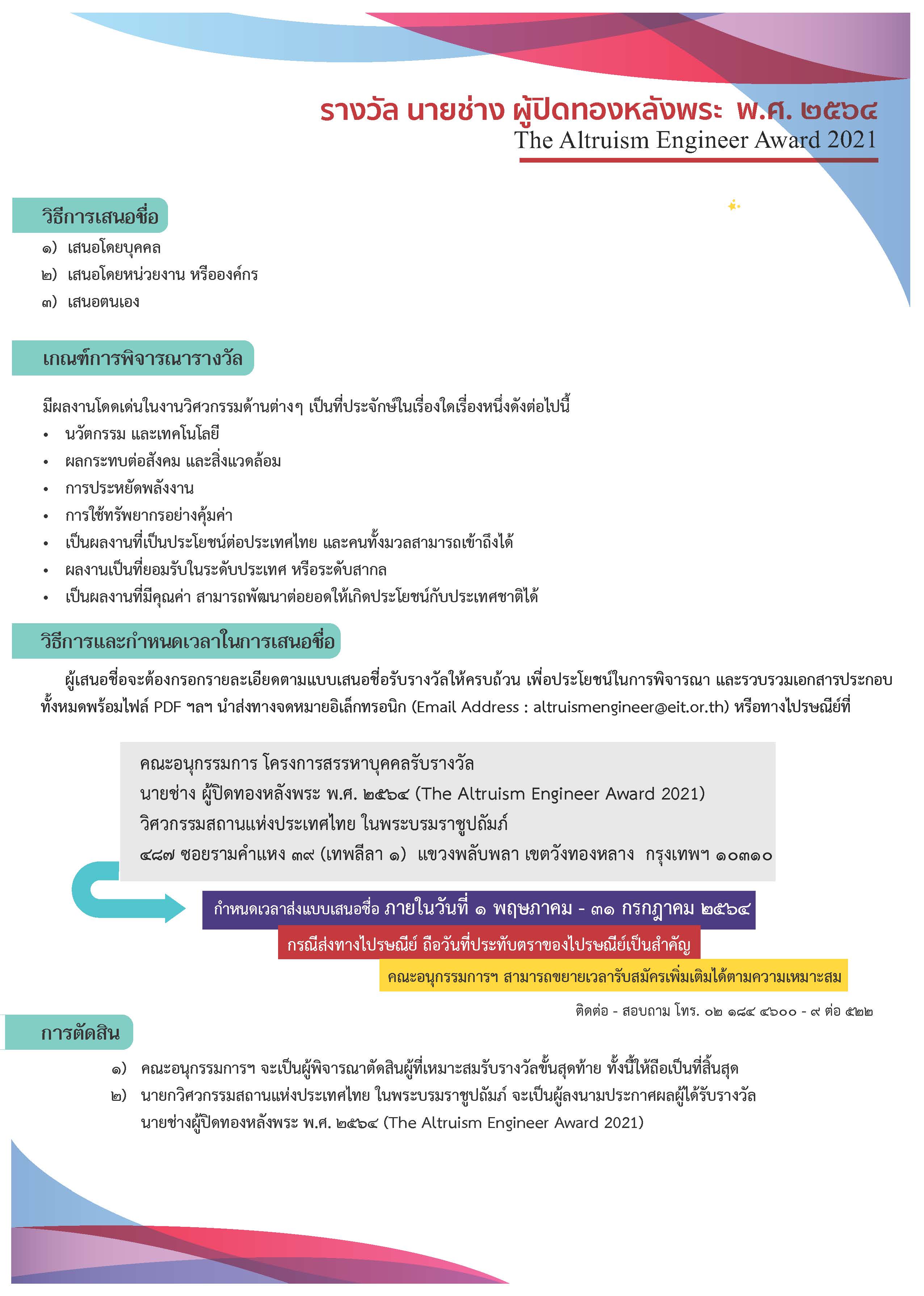 โครงการสรรหาบุคคลรับรางวัล นายช่าง ผู้ปิดทองหลังพระ ประจำปี 2564 (The Altruism Engineering Award 2021)