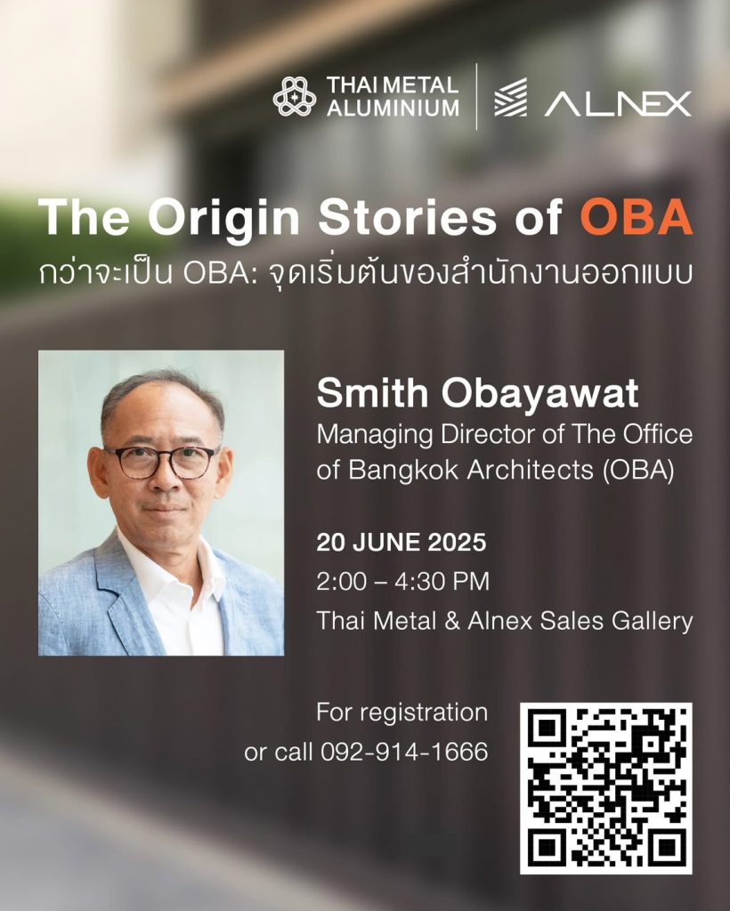 ด้วย บริษัท ไทยเม็ททอล อลูมิเนียมจำกัด และบริษัท อินโนเวชั่น ลิฟวิ่ง จำกัด (อัลเน็กซ์) จัดกิจกรรมบรรยายพิเศษ “The Origin Stories of OBA กว่าจะเป็น OBA: จุดเริ่มต้นของสำนักงานออกแบบ” ในวันที่ 20 มิถุนายน 2568 ณ Thaimetal & Alnex Sales Gallery บรรทัดทอง โดยได้รับเกียรติจาก คุณสมิตร โอบายะวาทย์ สถาปนิกผู้ก่อตั้ง  OBA-The Office of Bangkok Architects มาเป็นวิทยากรนั้น จึงขอความอนุเคราะห์ประชาสัมพั