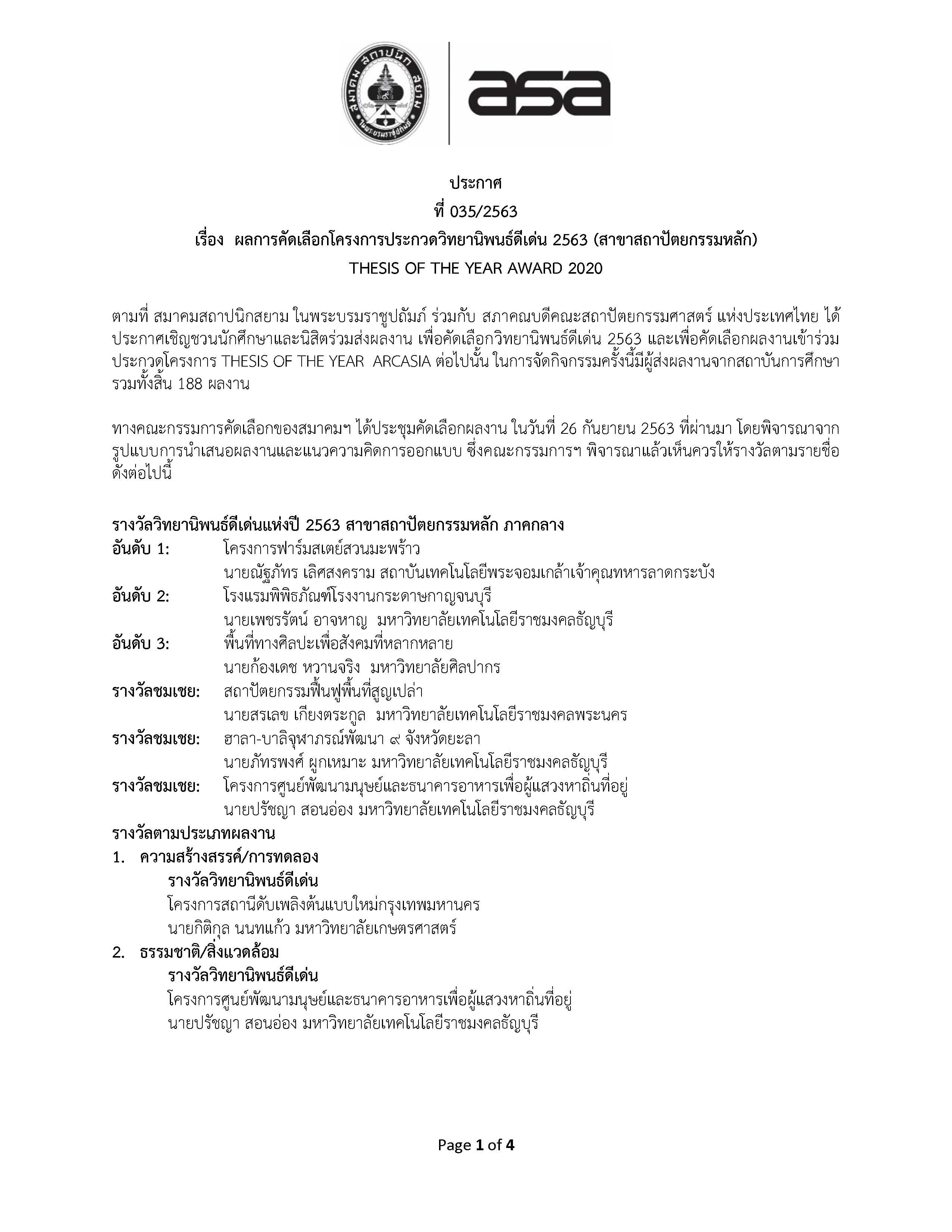 ประกาศ ผลการคัดเลือกโครงการประกวดวิทยานิพนธ์ดีเด่น 2563 (สาขาสถาปัตยกรรมหลัก) THESIS OF THE YEAR AWARD 2020