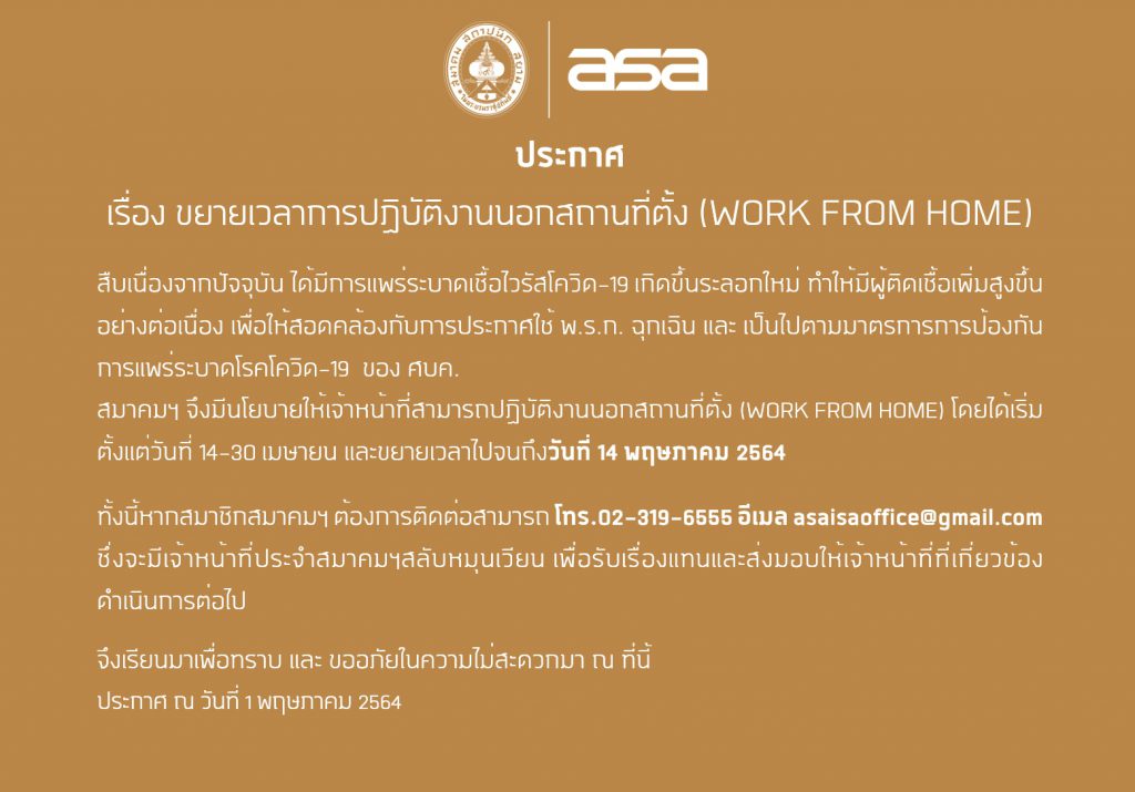 ประกาศ เรื่อง ขยายเวลาการปฏิบัติงานนอกสถานที่ตั้ง (WORK FROM HOME)